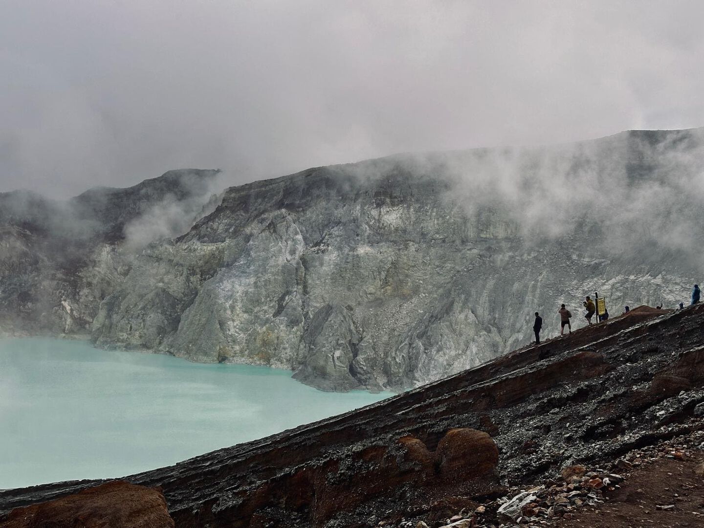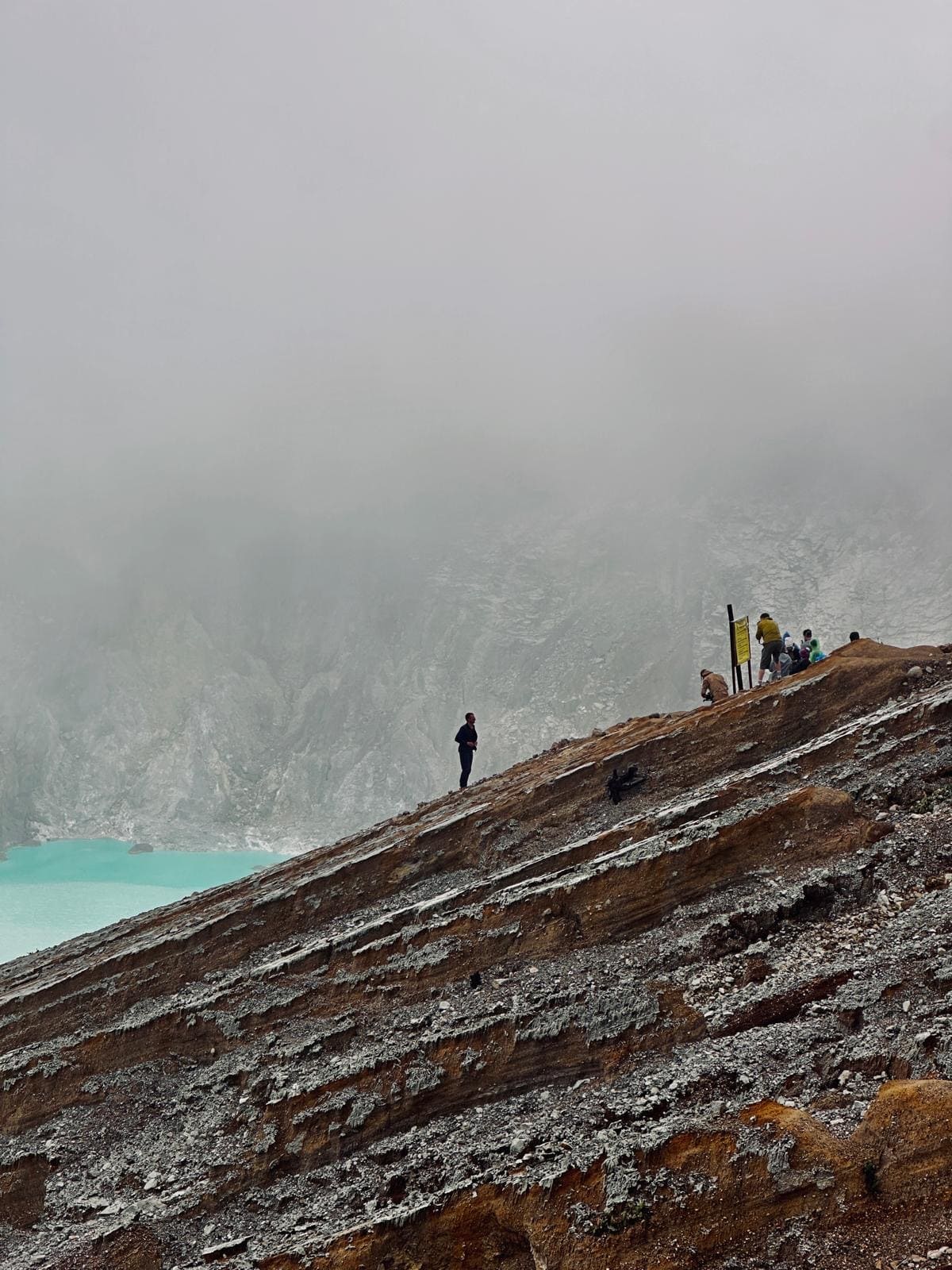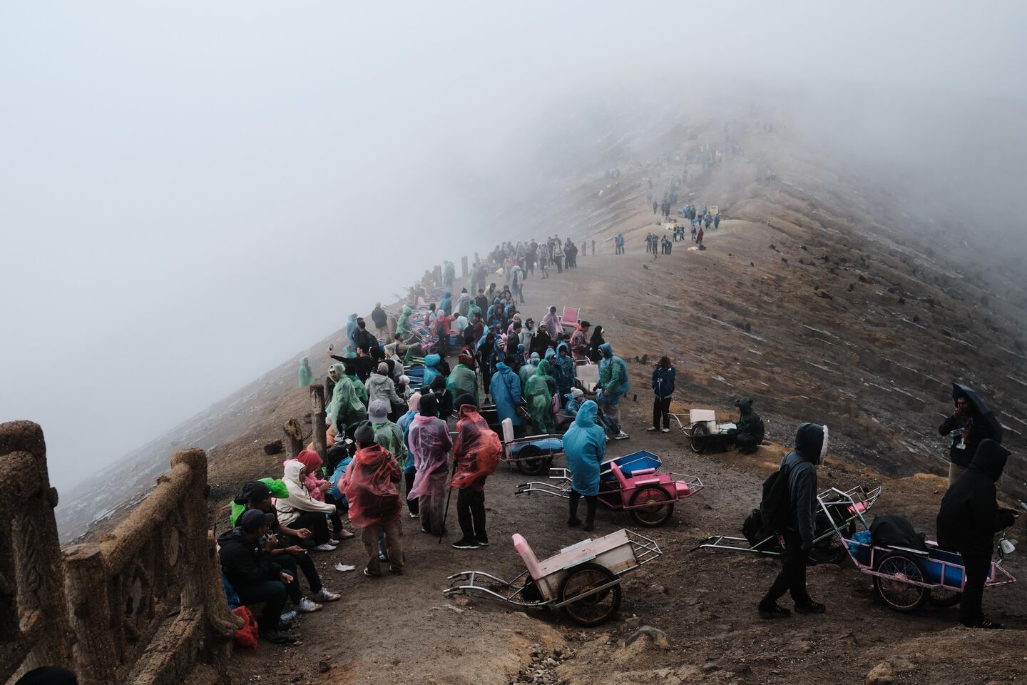 Our last hope is the Ijen volcano, famous for its crater with the bright blue sulphur lake. We leave at 4:00 in the morning. At the foot of the volcano we’re slightly shocked: we’re dropped off at what looks like the parking lot of an amusement park on a busy holiday. After an hour-long hike we reach the crater rim. The crater is wrapped in thick fog, the blue lake is completely invisible. What is clearly visible are the hundreds of noodle-slurping tourists, right around us. Eventually, we find a quiet spot on the crater wall, slightly away from the crowd. During the two hours we stay there, we get maybe two minutes of visibility through the mist. For the second time this week, we’re shooting photos inside a tourist trap.
