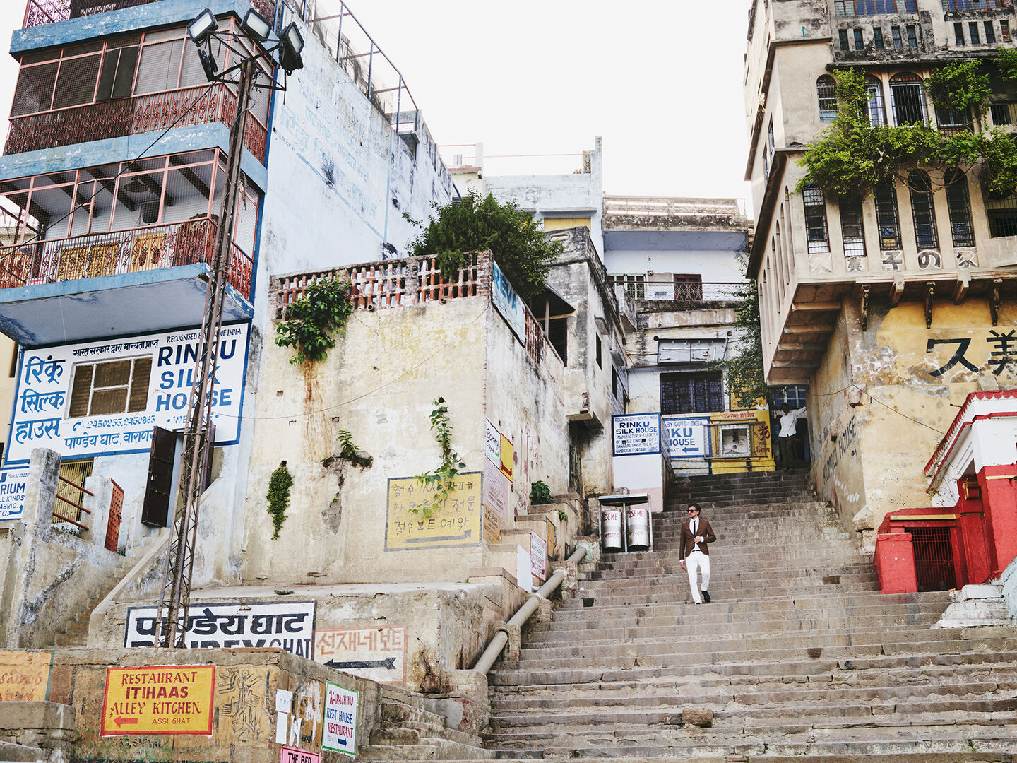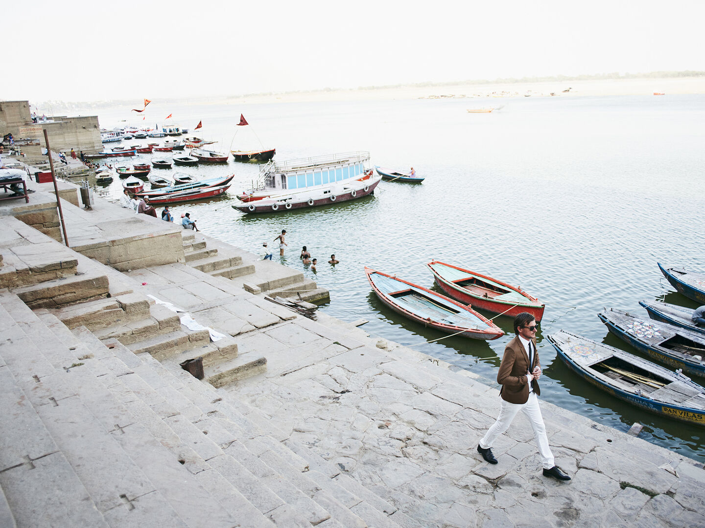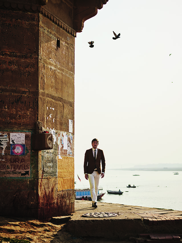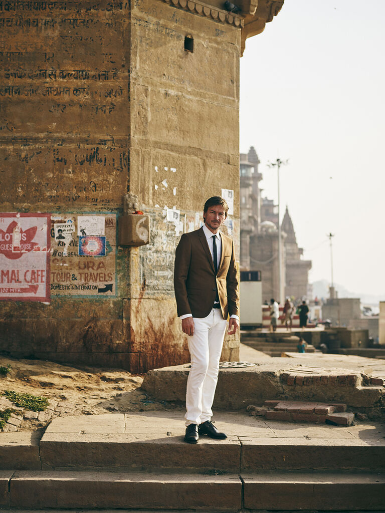 The photo we chose for the marketing campaign was taken in Varanassi, on the Ganges River. It was on the very last day, seven o'clock in the morning, and beads of sweat were running down my body. I walk around in clothes I've been wearing for days. On a trip like this, you never know when you're going to come across a beautiful location or beautiful light. So, I usually keep my photo clothes on to be able to jump straight into action. I didn't feel super fresh though. I also hadn't eaten anything for days due to sheer misery, BUT: The photo looks beautiful, relaxed and romantic. Elmar the photographer is a real miracle worker. What a crazy country...