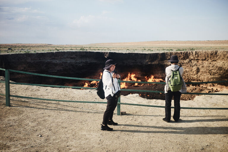 The tourist highlight, the sightseeing destination of Turkmenistan, the one thing that is in every travel guide, is the gas crater. It’s a large hole in the ground, the bottom of which is on fire non-stop. Our tour guide is surprised by our lack of interest in this oversized gas pit. I could’ve made a cool joke about the gas crater. When the beast was finally visible from our car and our guide said, "Look, there's the gas crater," I said, "My friends also call me the gas creator." We were all laughing and roaring of course.
