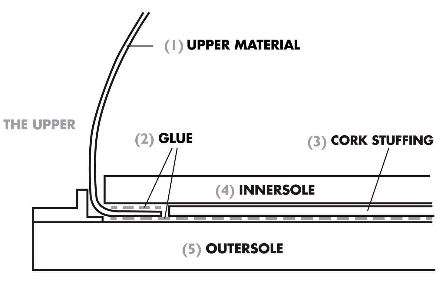 The upper material (1) is pulled on the last and fixed with glue (2) under the innersole (4). Under the foot a small amount of cork (3) is placed to support the foot. The prefinished outersole (5) (with a sole edge allready attached) is glued (2) to the innersole (4).