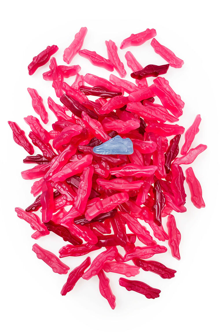 The original plan was to make our sneakers blue, and give them a different flavour. That would've been even more fun than mixing in pink sneakers with the already pink Cadillacs. In the end though, it turned out that the Pink Cadillac box would be considered a new product and that would cause trouble with supplying it to supermarkets, drug stores and gas stations. We did make a gazillion small sample bags that did contain the little blue sneakers though. I got to personally pick the taste for them, and in the press release I wrote this about that process: