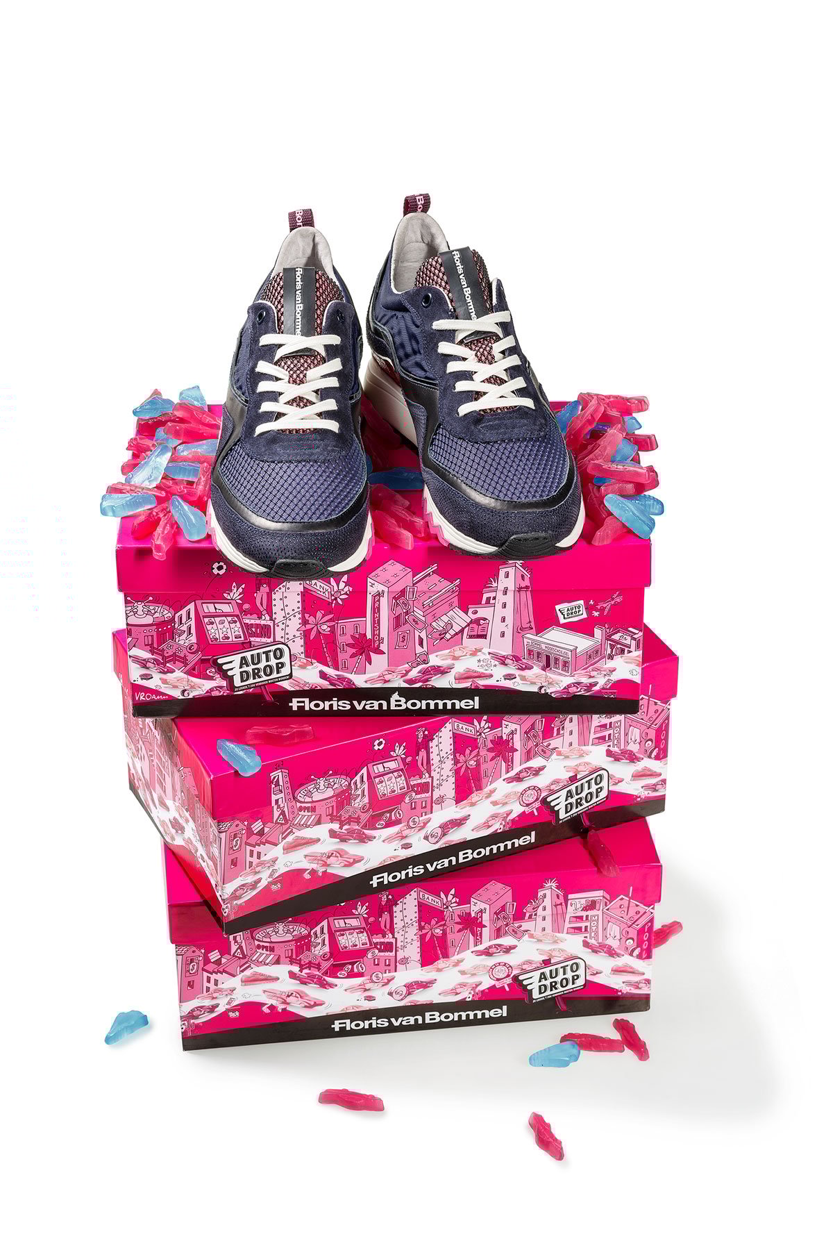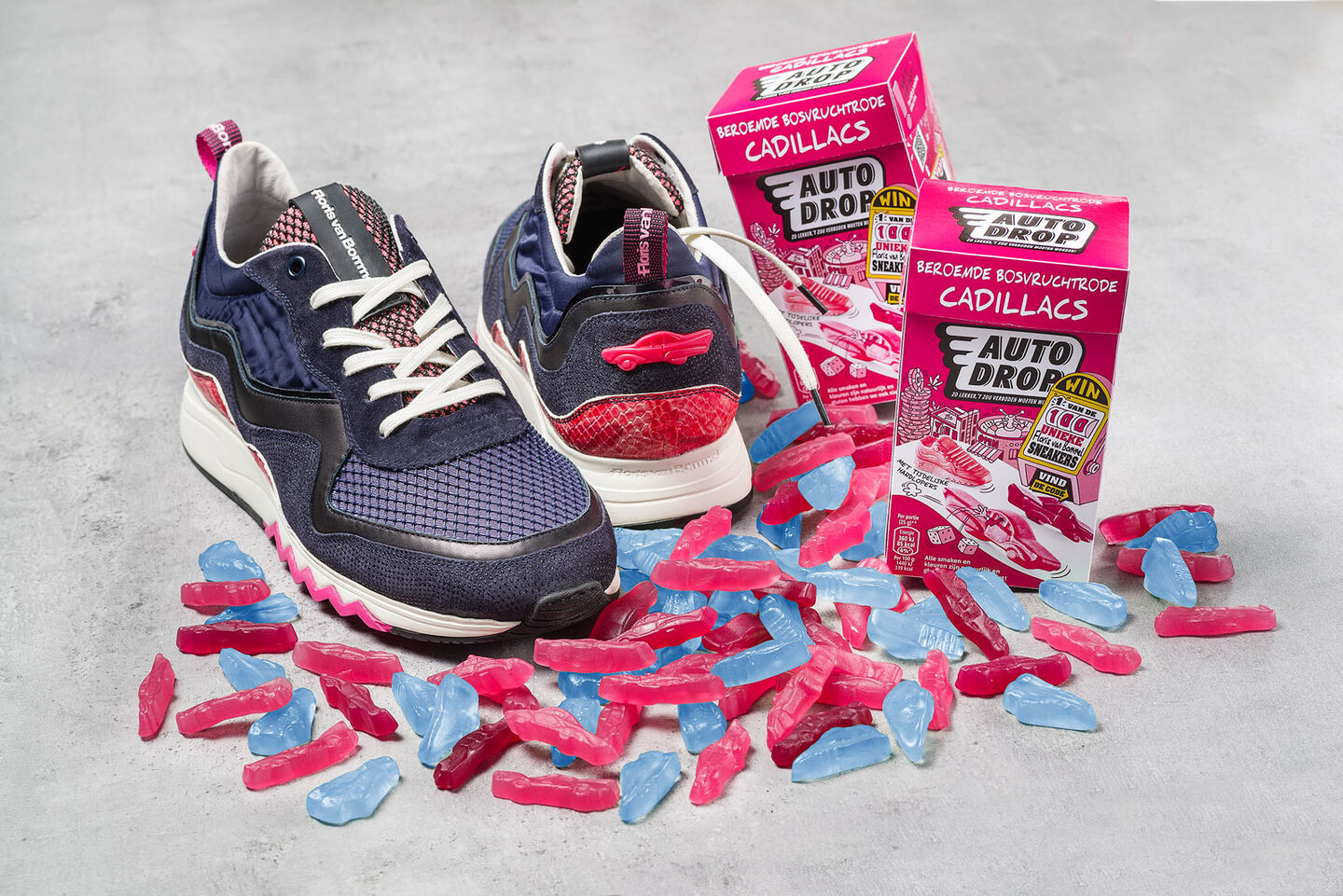 Floris: “For two months in the spring of 2019, pink candy sneakers mixed in with Autodrop's pink Cadillacs. All the boxes – and in those days I found out that the Dutch go through quite a lot of those in a few weeks – contained our little sneakers. This candy sneaker was modelled after a real-life limited edition 'Floris van Bommel & autodrop sneaker’. It turned out to be a huge campaign with all kinds of give-aways and loooooads of candy.
