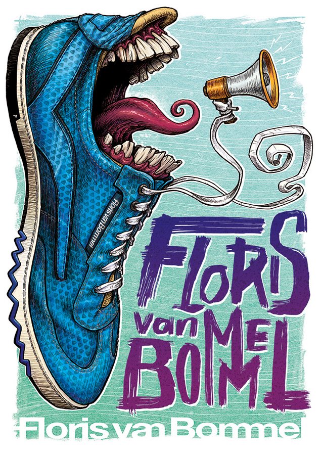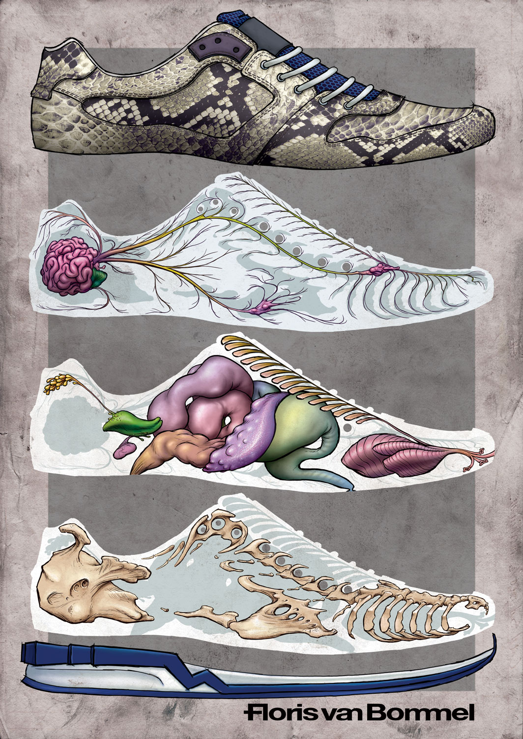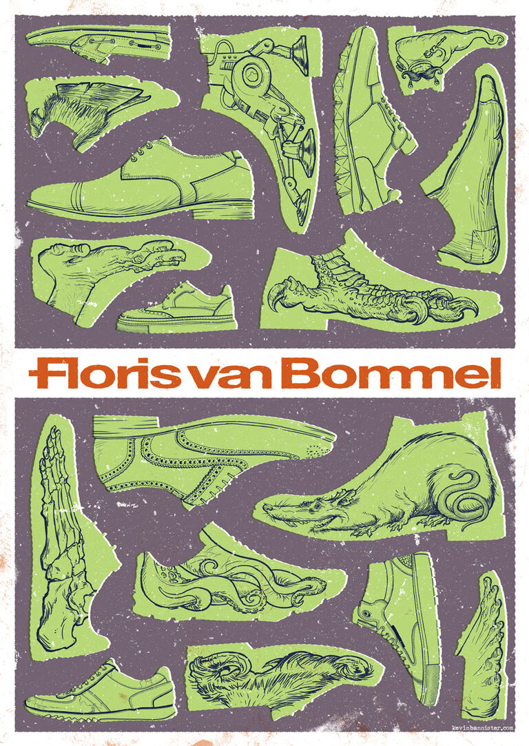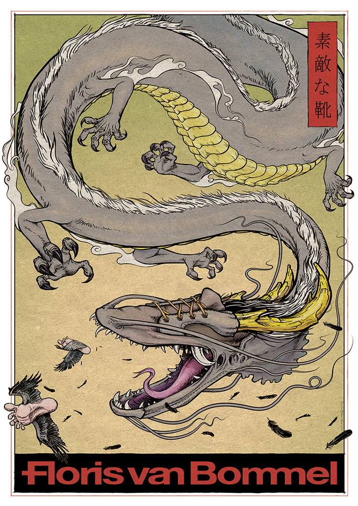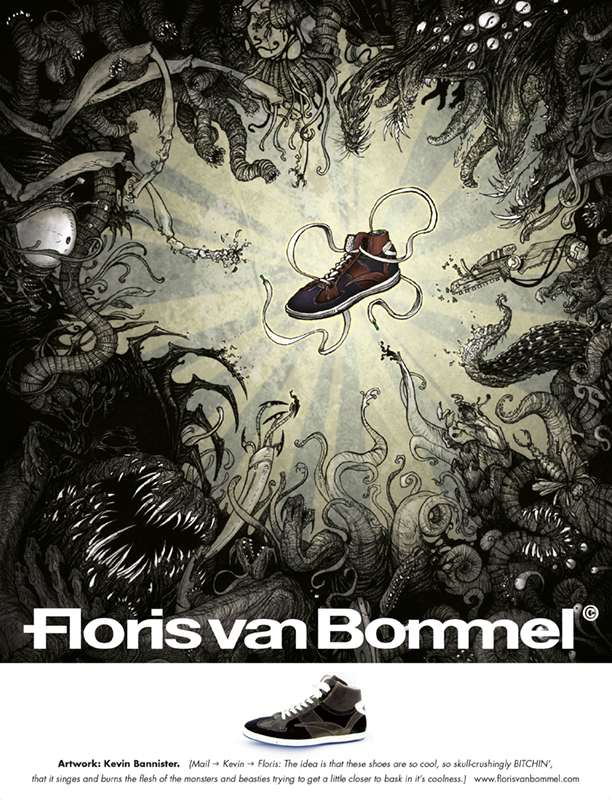 In the meantime, I had looked into the artist a bit more. His name was Kevin Bannister and back then he called himself 'creature designer'. I pretty much loved everything he had ever drawn. On his website, I noticed that he offered bespoke work as well. So I gathered my courage and sent him an email, asking if he'd like to draw an advertisement for us. Kevin was excited about the idea, and I gave him complete carte blanche. The result of that is the image below, a shoe surrounded by monsters. When Kevin emailed me his design, he added the following sentence as explanation: “The idea is that these shoes are so cool, so skull-crushingly BITCHIN’, that it singes and burns the flesh of the monsters and beasties trying to get a little closer to bask in its coolness." I loved that quote so much that I added it as a footnote on the bottom of the ad.