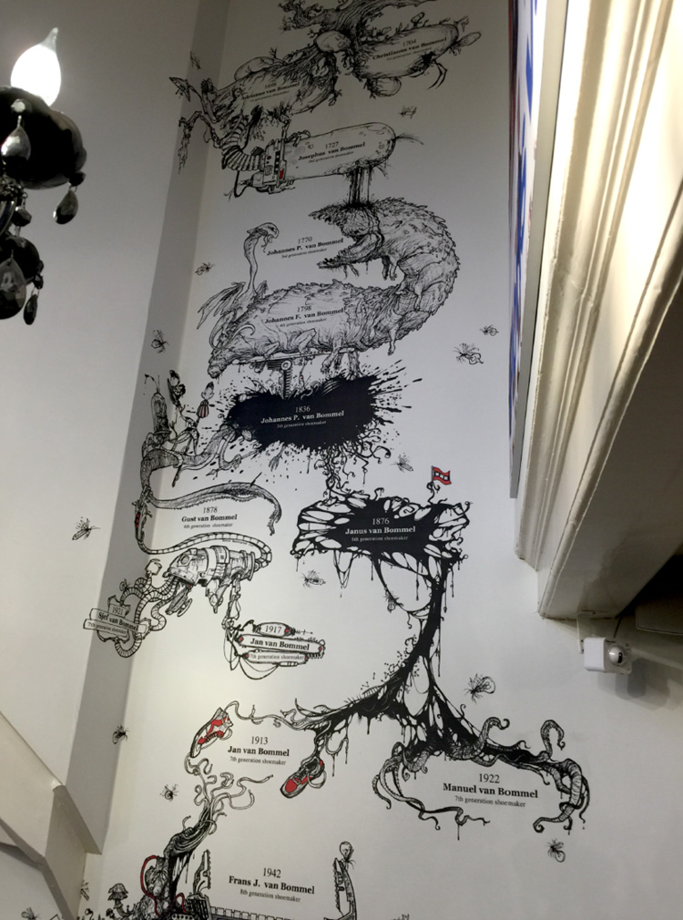 Throughout the years, Kevin has drawn quite a few more monsters for all kinds of purposes for us. the most special ones are probably the four family trees he drew. Family trees are of course a bit boring, but for our company it's a great way to show that we've been making shoes for nine generations already. Kevin's designs made those family trees not just informative, but cool as well."