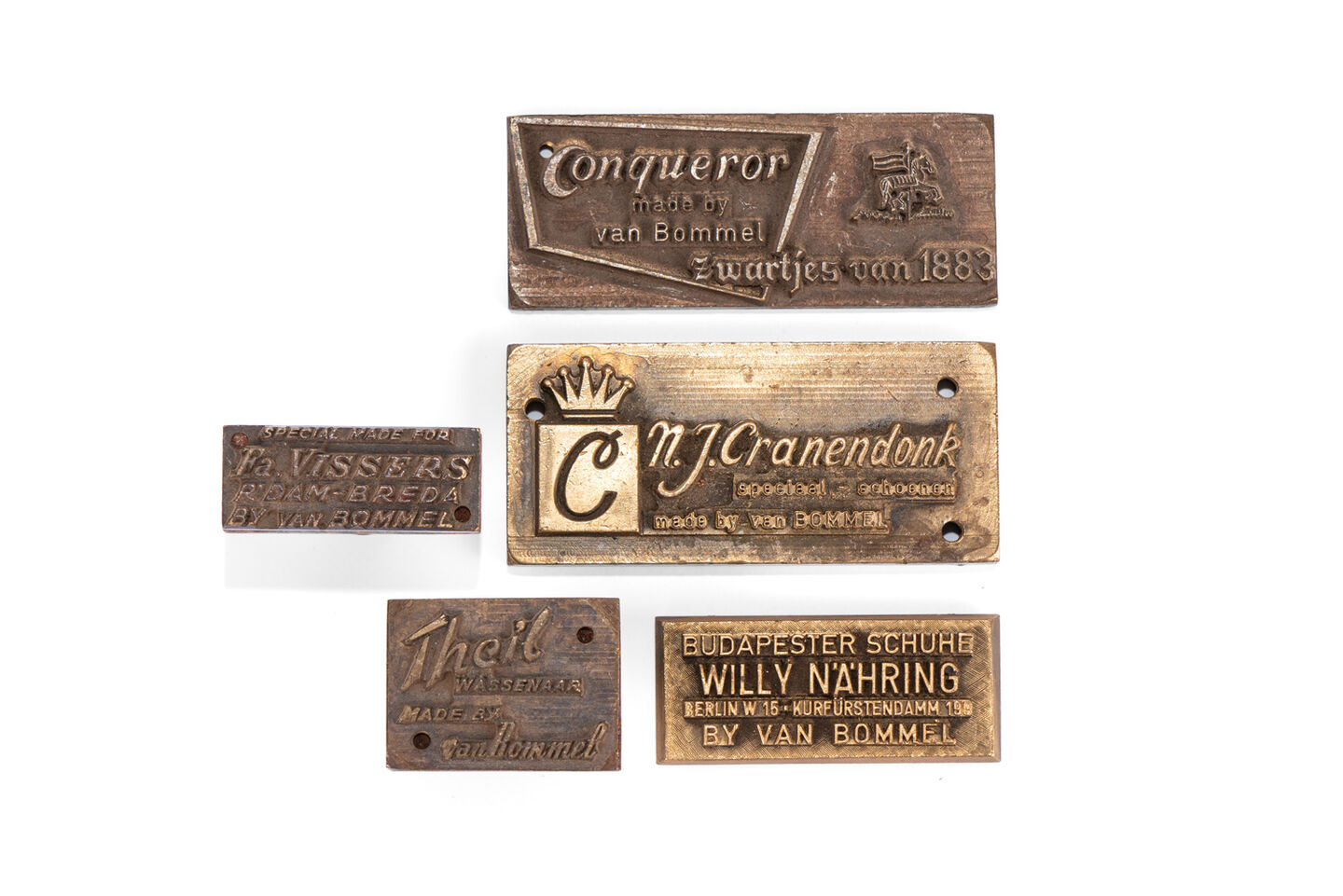 (Image below: Insole stamps for private labels produced by Van Bommel between 1950 and 1980 (Stamps are always in mirror image. For readability, we have mirrored them here.)