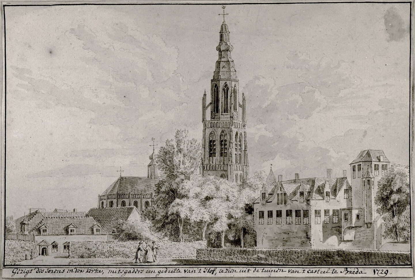 (Image below: Breda in 1729. Pen drawing by Cornelis Pronk from the Breda city archive.)